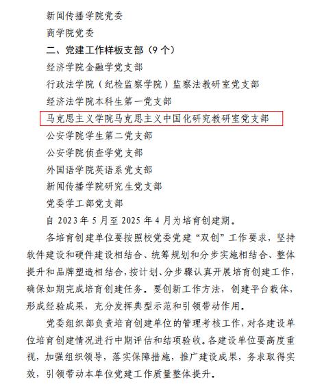 马克思主义中国化研究教研室党支部申报的“党建工作样板支部”位列其中。