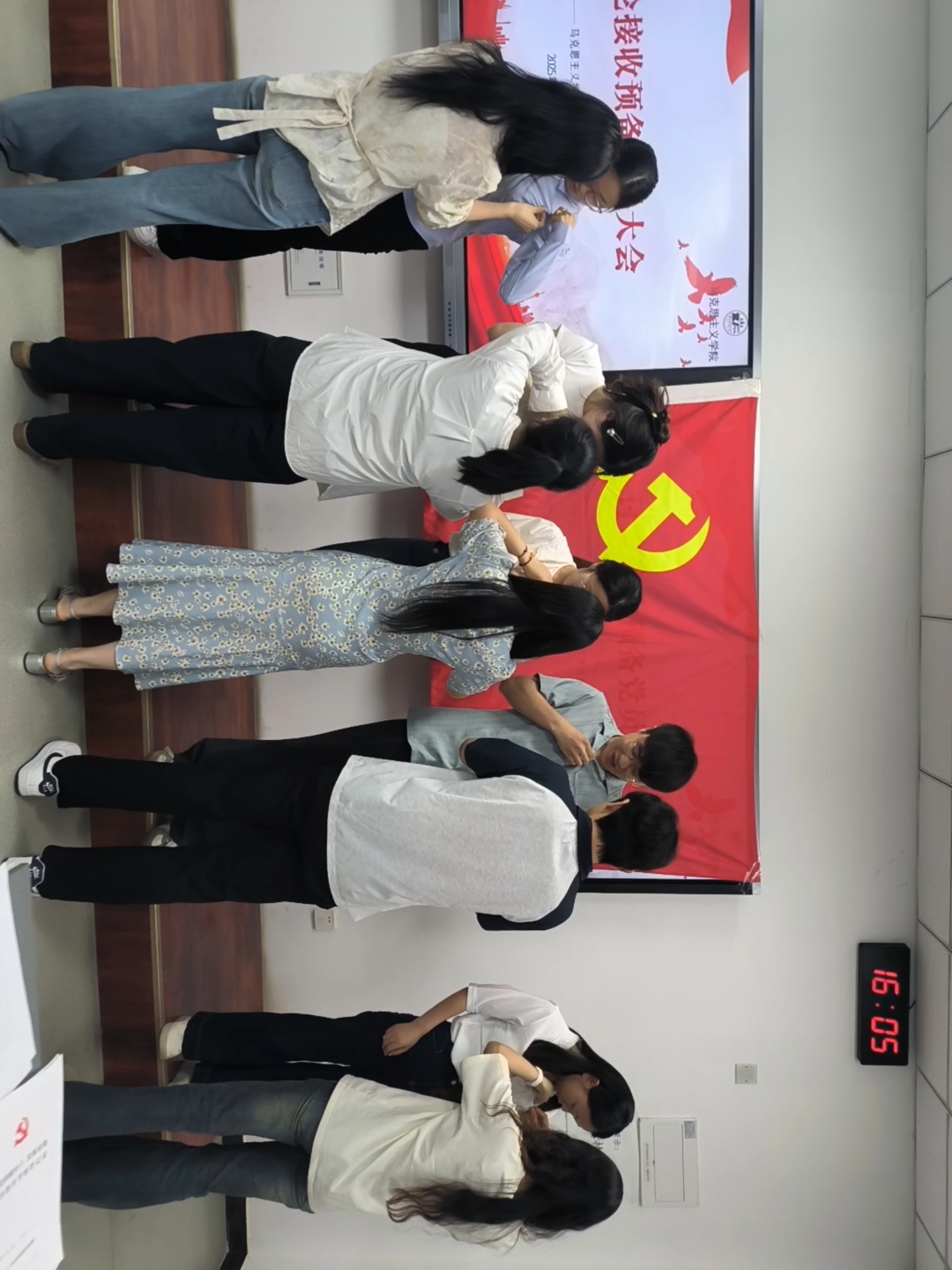 接着,各入党介绍人为杜佳欣等五名预备党员佩戴党徽。随后,杜佳欣同志代表五名新生党员向大会作表态发言。