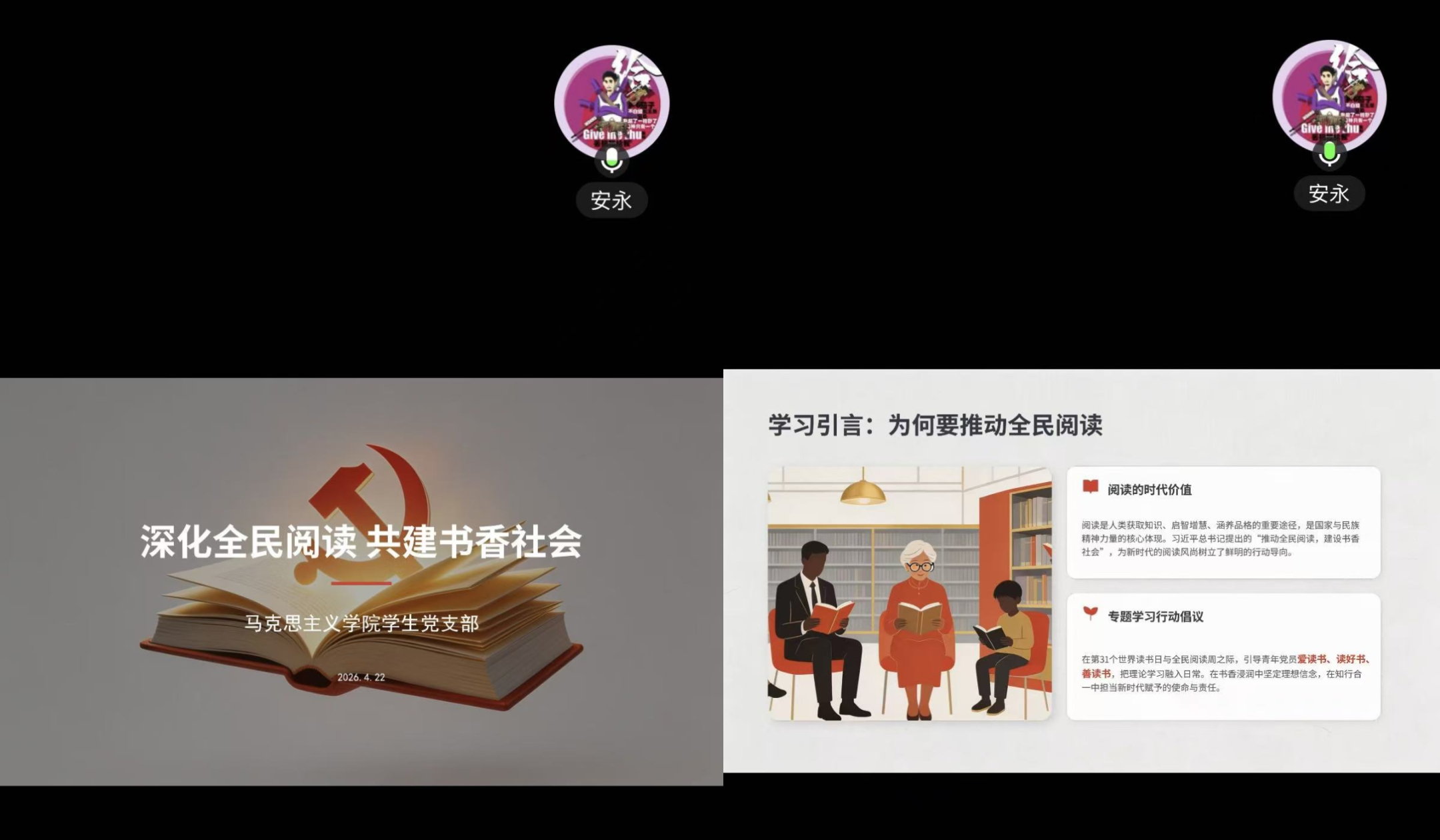 学生党支部组织各党小组开展“深化全民阅读,共建书香社会”主题理论学习。三个党小组结合成员实际,创新形式开展学习,推动学习成效走深走实、入心入脑。