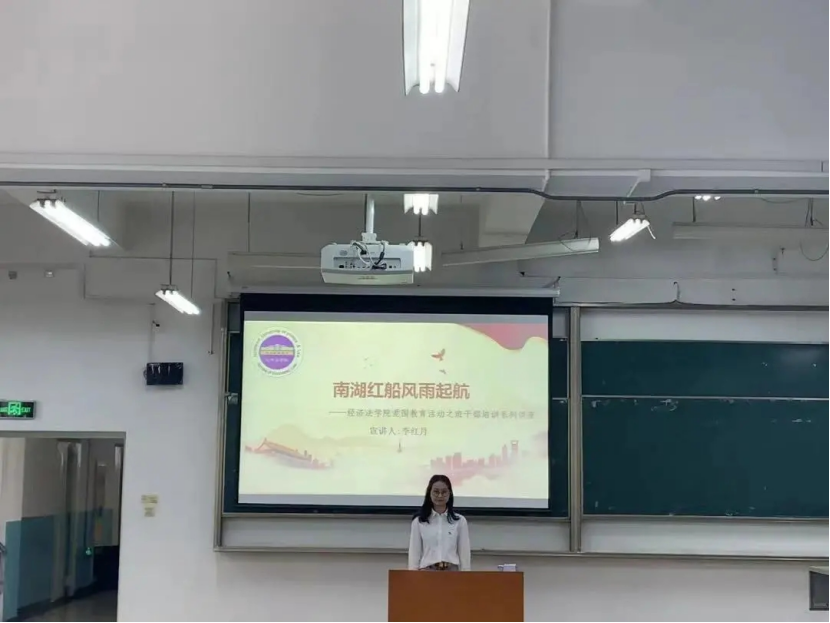第一位宣讲人李红月同学以“南湖红船,风雨起航”为主题,讲述了中共一大召开的历史史实和“红船精神”的内涵两大部分内容。第一部分围绕一大召开背景、组建共产党的必要性和重要性及党成立的艰辛历程等问题为经济法学院同学做了生动讲解。第二部分以“小船诞生大党”为切入点,深入讲解“红船精神”的内涵及当代价值,呼吁同学们在实际生活中,身体力行地传承开天辟地、敢为人先的“红船精神”,成为“红船精神”坚定捍卫者、忠实传承者、自觉践行者,让红色基因代代相传、精神力量生生不息。