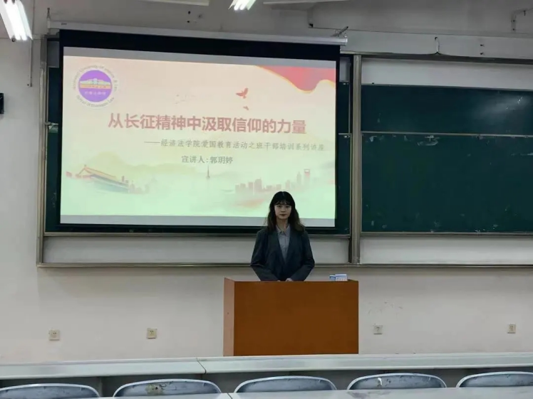 第三位宣讲人郭玥婷同学以“从长征精神中汲取信仰的力量”为主题,带领同学们回顾了波澜壮阔的长征历程。她以长征中的重要战役、长征中的重要会议、长征线路三个方面为主线进行讲授。血战“湘江”、巧渡“金沙江”、强渡“大渡河”、飞夺“泸定桥”等重要战役,遵义会议、瓦窑堡会议等重要会议,途径11个省的长征路线,丰富的党史资料、精准的数据资料,郭玥婷同学带领大家“重走”长征路。现场同学们都充分感受到革命先辈不怕牺牲、坚韧不拔、自强不息的长征精神,并表示将在实际生活中践行长征精神,奋力前行,走好新时代的长征路。