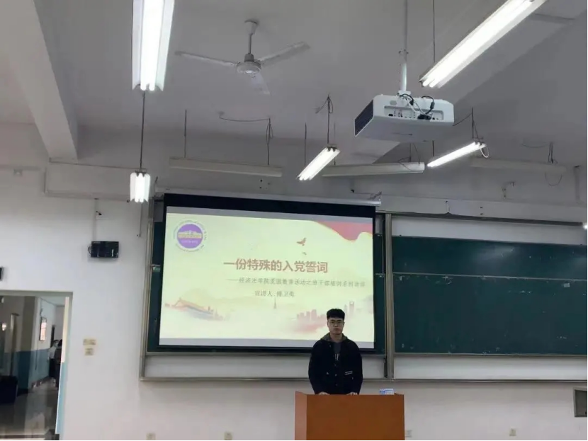第二位宣讲人傅卫勇同学以“一份特殊的入党誓词”为主题,讲述了一位农民党员—贺页朵入党的感人故事,并以使命与担当为主线,从革命理想高于天、入党初心不能忘、人民利益放第一、崇德修身记心上、知行合一树形象等方面向同学们提出建议,希望大家从党史的学习中汲取精神力量、勇担时代重任,激励每位党员都要牢记入党誓词,坚定入党初心,不忘党员使命。