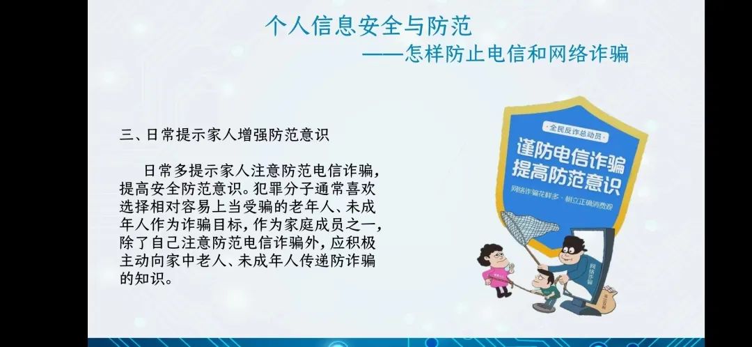 围绕“网络安全”这一主题,申程元从三个方面讲述了常见的网络骗局以及防范措施。首先,在个人信息安全与防范方面,以电信诈骗为典型,针对其骗局,我们要牢记“反诈骗公式”,警惕八个“凡是”,坚持“六不”,日常提醒家人增强防范意识。其次,从国内外网络安全局势来看,网络安全是当前国际社会面临的共同挑战。最后,申程元围绕网络安全的法律与规范,警示同学们要正确使用网络,争取让网络成为我们生活中的帮手。