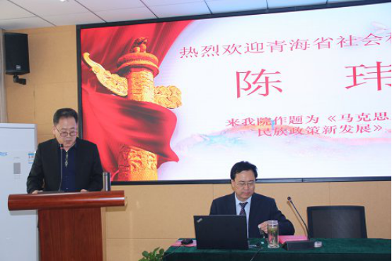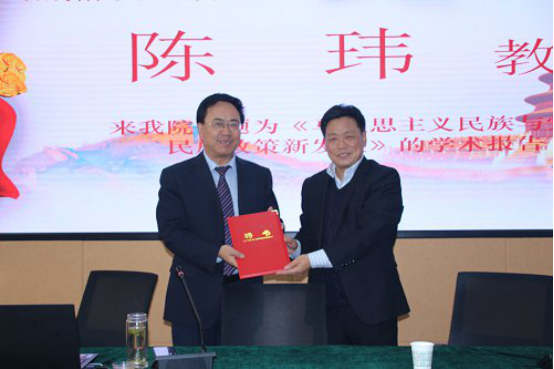 2019年11月8日下午,青海省社会科学院党组书记、院长陈玮教授在日本三级片 报告厅学术报告厅作了题为《马克思主义民族观与党的民族政策新发展》的学术讲座。讲座由日本三级片 院长魏奇教授主持,日本三级片 和反恐怖主义学院百名师生聆听了报告。校党委副书记李平安出席并为陈玮教授颁授日本三级片 荣誉教授证书。
