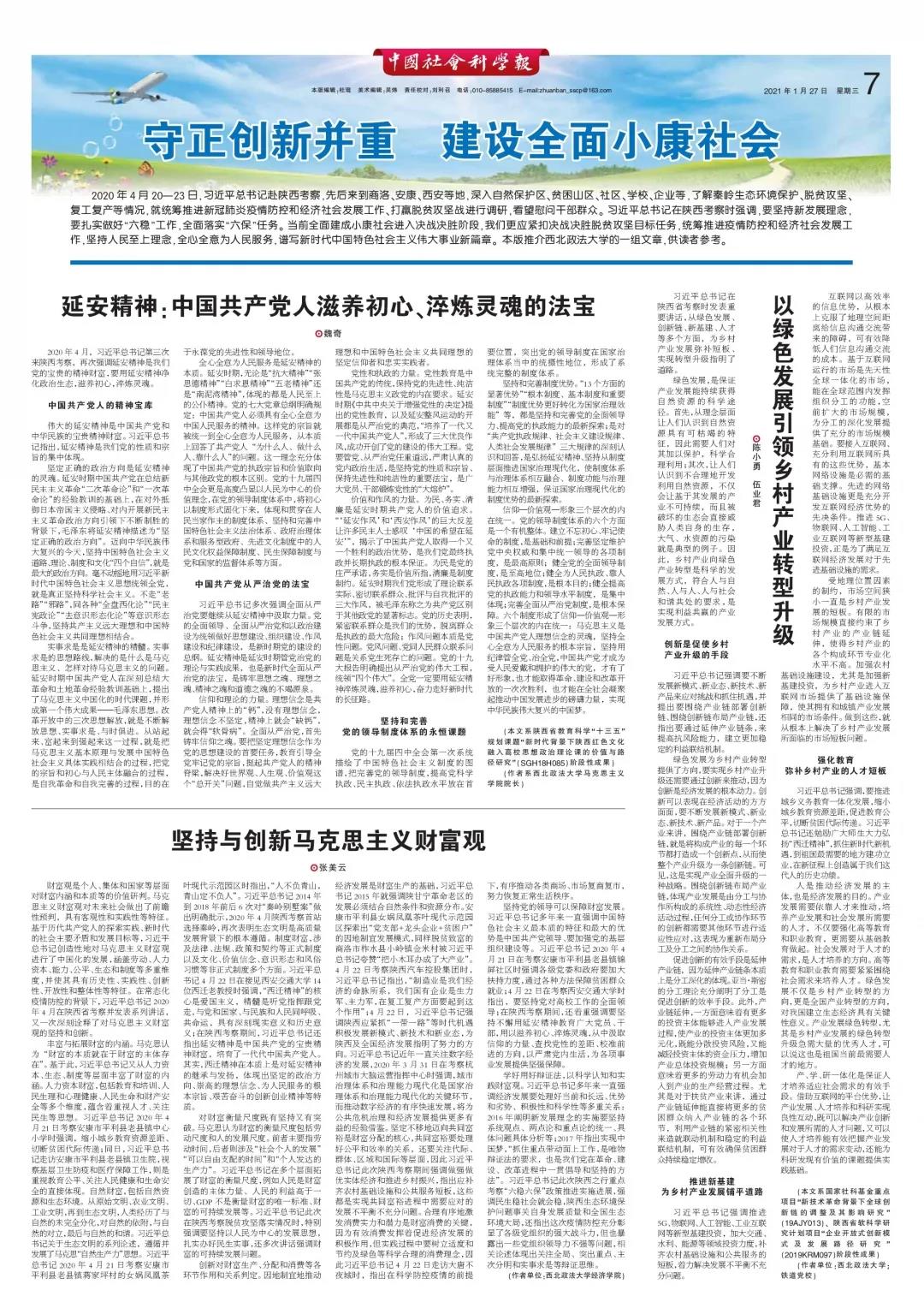 1月27日,日本三级片 院长魏奇教授在中国社会科学报上发表文章《延安精神:中国共产党人滋养初心、淬炼灵魂的法宝》。