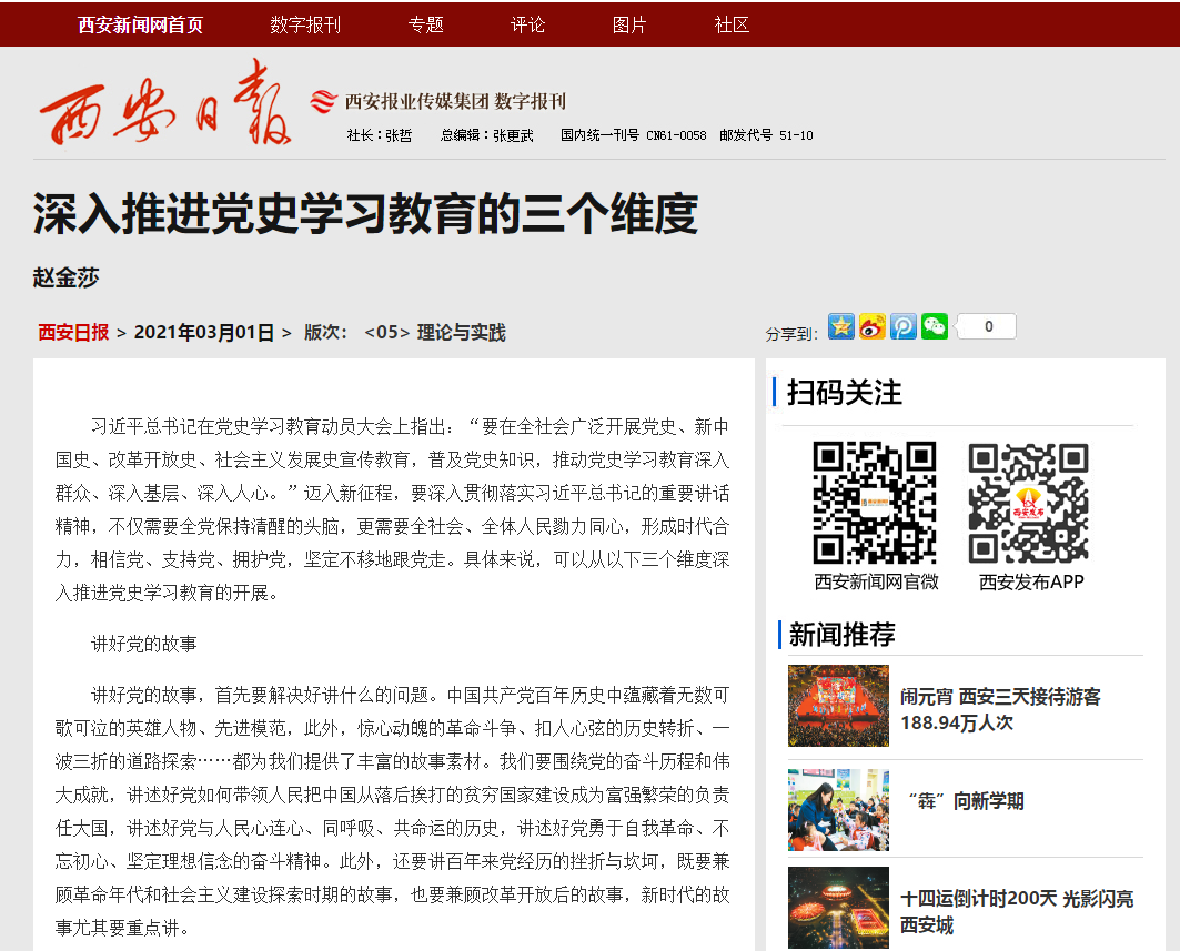 习近平总书记在党史学习教育动员大会上指出:“要在全社会广泛开展党史、新中国史、改革开放史、社会主义发展史宣传教育,普及党史知识,推动党史学习教育深入群众、深入基层、深入人心。”迈入新征程,要深入贯彻落实习近平总书记的重要讲话精神,不仅需要全党保持清醒的头脑,更需要全社会、全体人民勠力同心,形成时代合力,相信党、支持党、拥护党,坚定不移地跟党走。具体来说,可以从以下三个维度深入推进党史学习教育的开展。