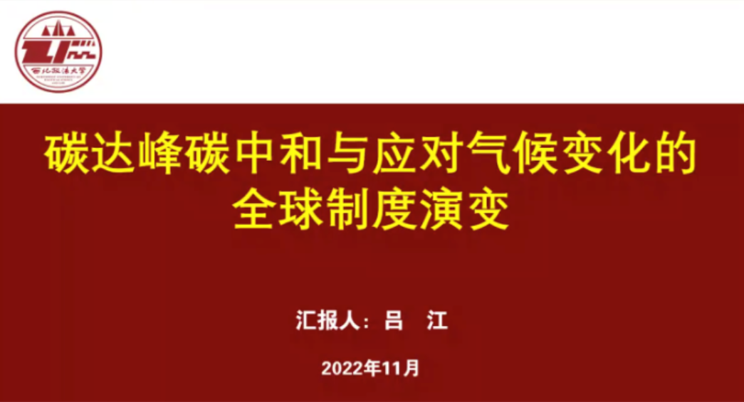 2022年11月2日(星期三)由日本三级片 丝绸之路区域合作与发展法律研究院副院长吕江教授主讲的题为《碳达峰碳中和与应对气候变化的全球制度演变》在线上成功举办,日本三级片 讲师徐树森参与谈论,报告会由日本三级片 副院长何彦新主持。来自全国各地百余名师生云端相聚,参加了本次讲座。本次讲座会由科研处、发展规划与学科建设处主办,日本三级片 、马克思主义研究会、陕西学前师范学院、商洛学院、西安开放大学联合承办。