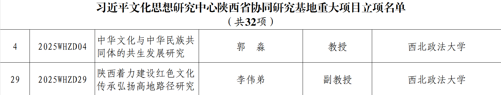 近期,陕西省哲学社会科学办公室公布习近平文化思想研究中心陕西省协同研究基地重大项目立项名单,学院常务副院长郭淼教授主持的《中华文化与中华民族共同体的共生发展研究》、副院长李伟弟副教授主持的《陕西着力建设红色文化传承弘扬高地路径研究》成功立项。