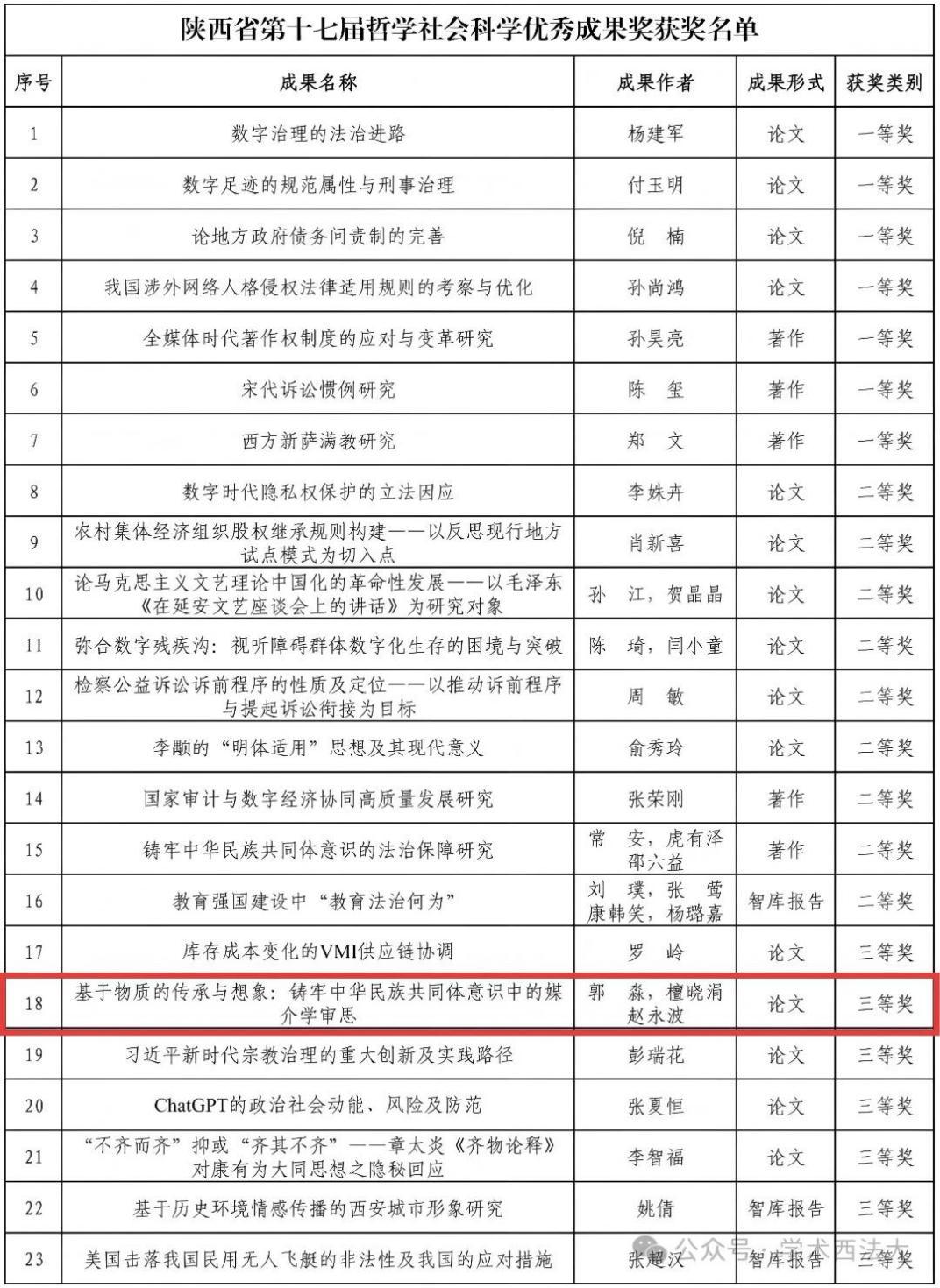 近期,陕西省第十七届哲学社会科学优秀成果奖评选结果揭晓,我校科研工作再创佳绩,共23项优秀成果荣获嘉奖,涵盖一等奖7项、二等奖9项、三等奖7项,获奖总数与层次均位居全省高校前列。其中,日本三级片