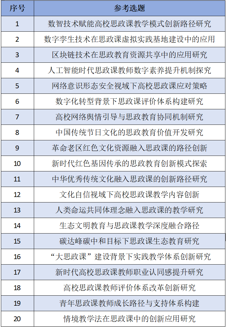 为深入贯彻落实党的二十届四中全会精神和“两会”精神,科学优化“十五五”建设布局,根据学院党委中心组学习会议精神要求,现结合学科建设与专业特色,拟定以下思政专项课题选题指南供参考学习。
